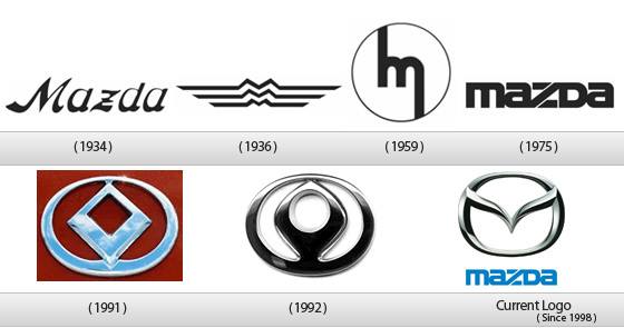 В отличие от перечисленных выше автомобильных марок, логотип следующей японской компании за всю свою историю пережил весомые изменения в своем обличии. Первый логотип «Mazda» появился в 1934 году и представлял собой обычную надпись своего названия курсивом. Само название «Mazda» было выбрано не просто так, а по имени древнеиранского божества Ахура-Мазда, который являлся творцом солнца, луны, звезд, неба, земли вод, деревьев и людей. И к тому же это имя было созвучно с фамилией основателя компании Дзидзиро Мацуда.