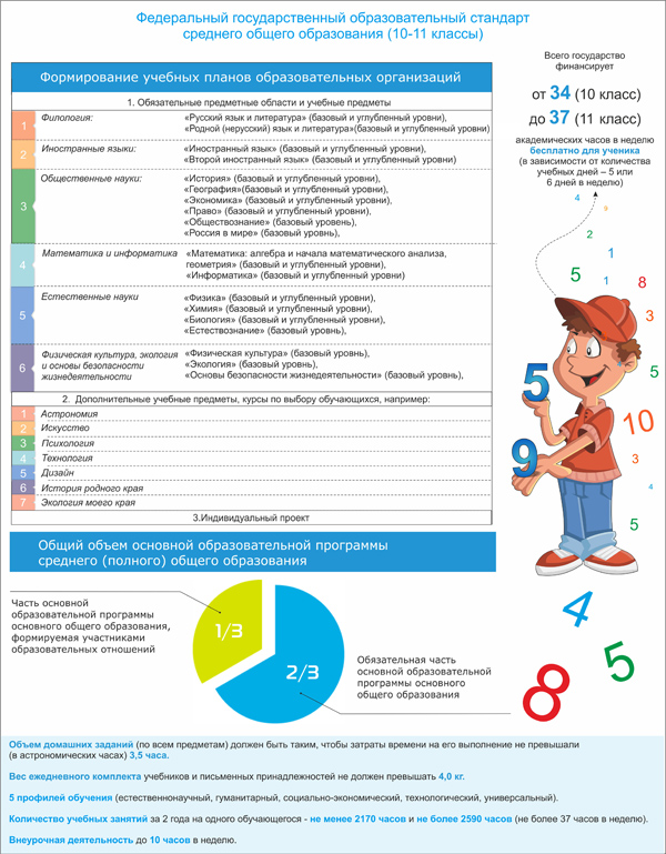 В новом стандарте для старшей школы шесть предметных областей, которые являются обязательными. Но это вовсе не значит, что придется изучать все предметы из этих областей. Кроме того, есть семь дополнительных дисциплин, включая астрономию, историю родного края, дизайн, и индивидуальный проект.